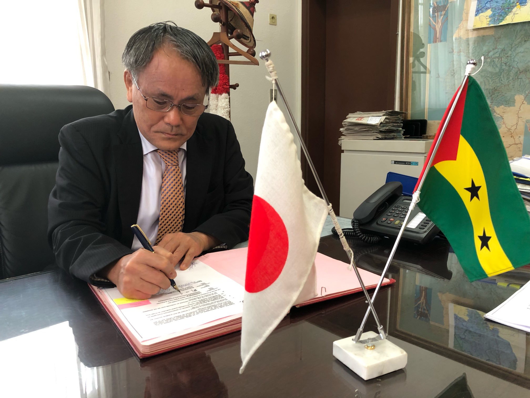 L’Ambassadeur du Japon S.E.M. NOGUCHI Shuji et M. Antonio Dias, Directeur Exécutif de la Coopérative d’Exportation de Cacao Biologique (CECAB) de Sao Tomé et Principe ont finalisé le 07 février 2023, en présence de S.E. M. Abel da Silva Bom Jesus, Ministre de l'Agriculture, du Développement rural et de la Pêche, la signature du contrat de don pour « Le Projet d’ Equipement de l’usine de production et transformation de cacao à l’île de Sao Tomé» financé par le Japon pour un montant de 76.691 € soit environ deux millions de dobras dans le cadre du programme de coopération bilatérale dénommé les « Dons aux micro-projets locaux contribuant à la sécurité humaine ».
