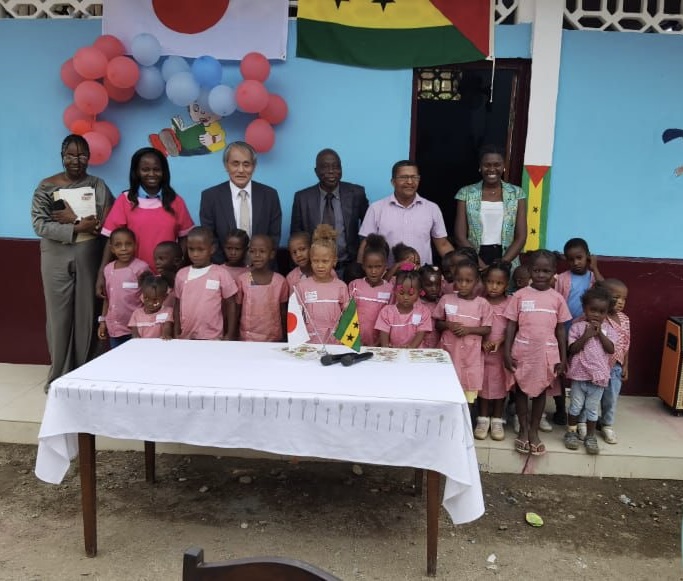 L’Ambassadeur du Japon S.E.M. NOGUCHI Shuji et Mme. Izilda Soares, Directrice du Jardin d’enfants de Bombom, dans le district de Mé Zochi, à Sao Tomé et Principe, ont procédé le lundi 06 février 2023 à la cérémonie officielle de remise de don pour « Le Projet de construction et de réhabilitation du Jardin d’enfants de Bombom » financé par le Japon pour un montant de 71.000 € soit environ deux millions de dobras dans le cadre du programme de coopération bilatérale dénommé les « Dons aux micro-projets locaux contribuant à la sécurité humaine ».