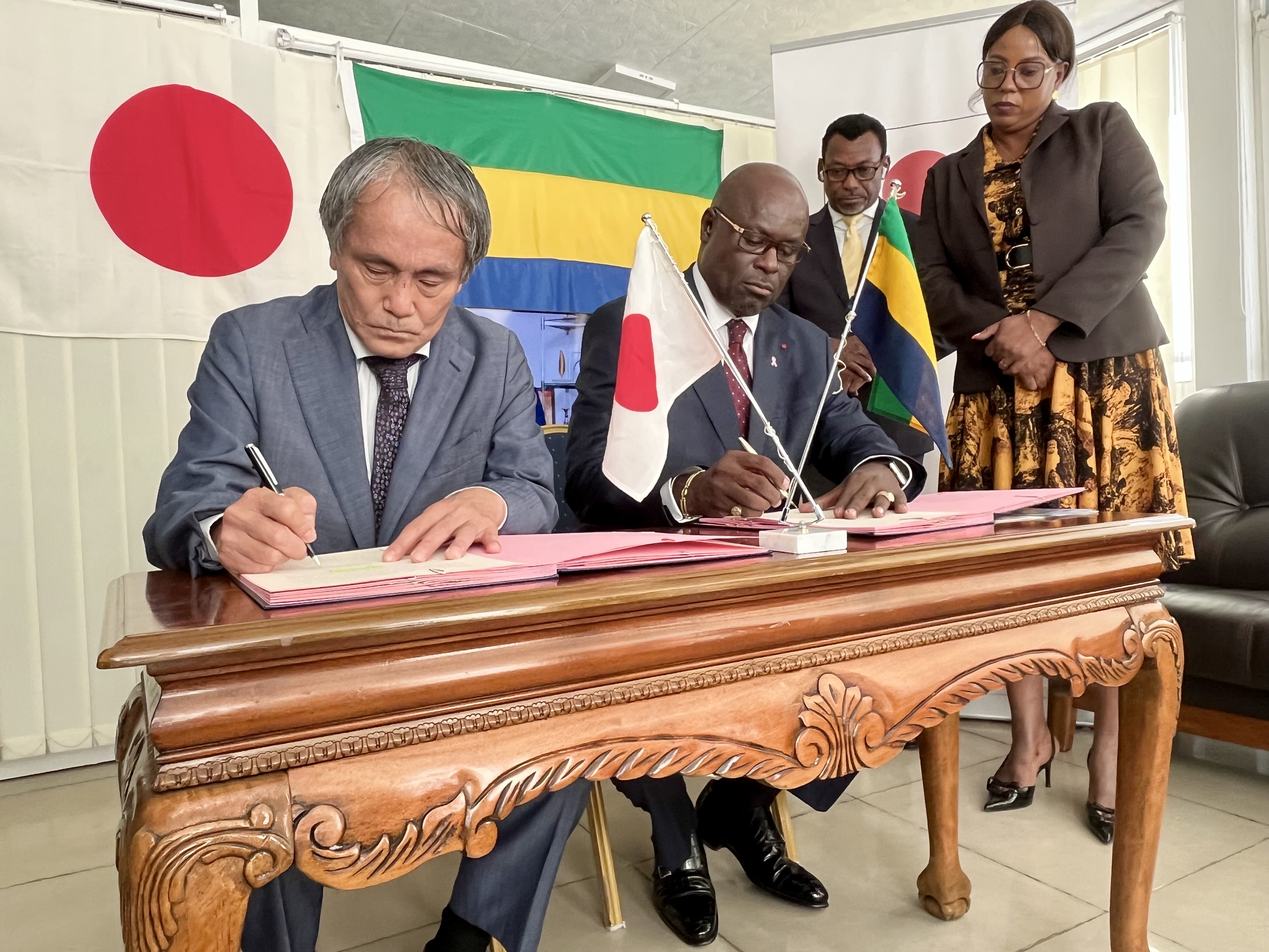 Le vendredi 3 octobre, S.E.M. NOGUCHI Shuji, Ambassadeur du Japon, a procédé à la cérémonie de signature de l’Échange de Notes relative à l’Aide non remboursable du « Programme de Développement Économique et Social », avec S.E.M. Michel Régis ONANGA M. NDIAYE, Ministre des Affaires Etrangères et de la Coopération. Ce programme, financé par le Gouvernement du Japon d’un montant de 200 millions de yens japonais (plus de 800 millions de FCFA), permettra d’équiper tous les hôpitaux régionaux du Gabon, ainsi que plusieurs centres de santé, en analyseurs hématologiques de la société japonaise, Sysmex, capables de réaliser rapidement le diagnostic du paludisme.