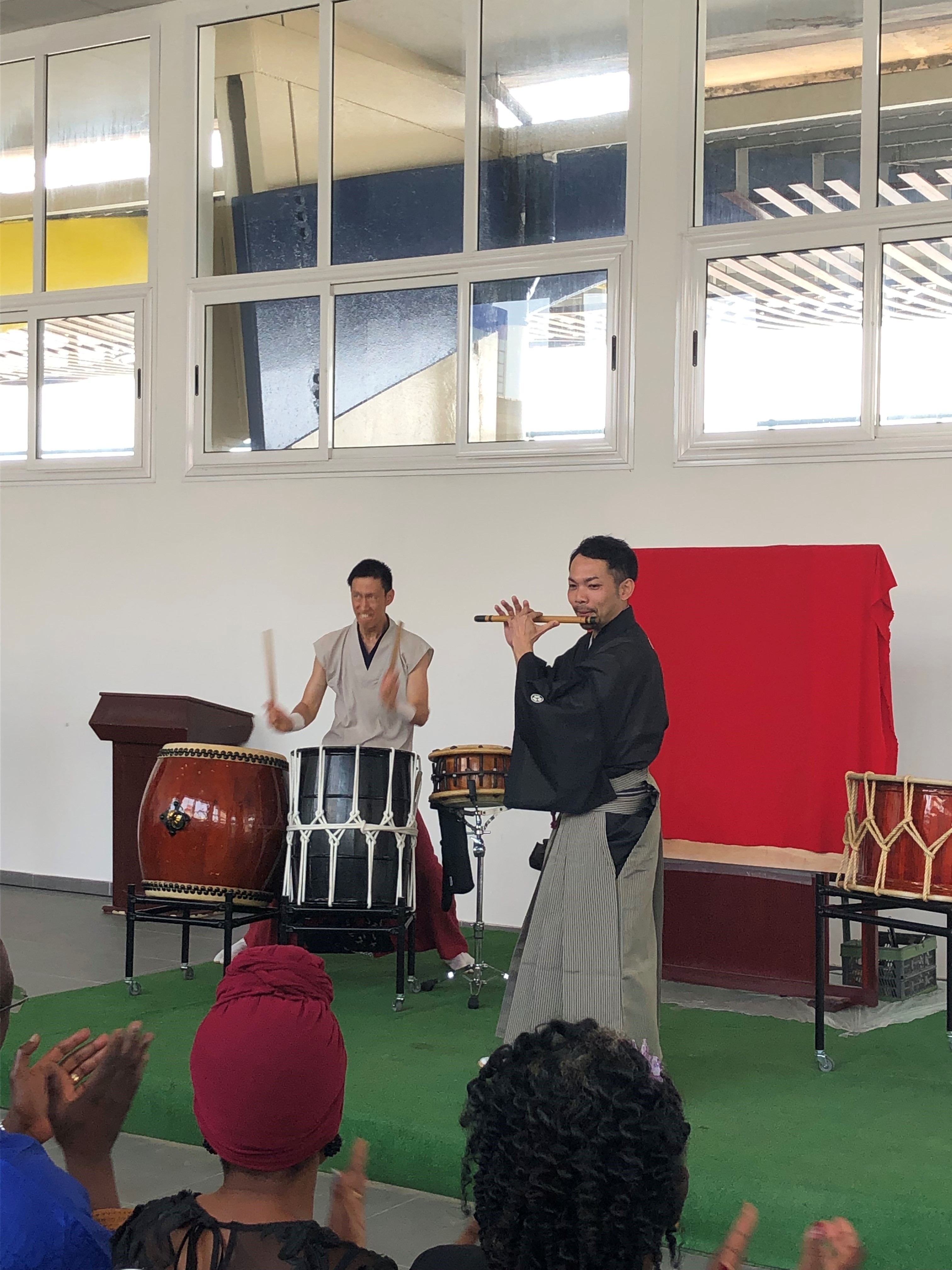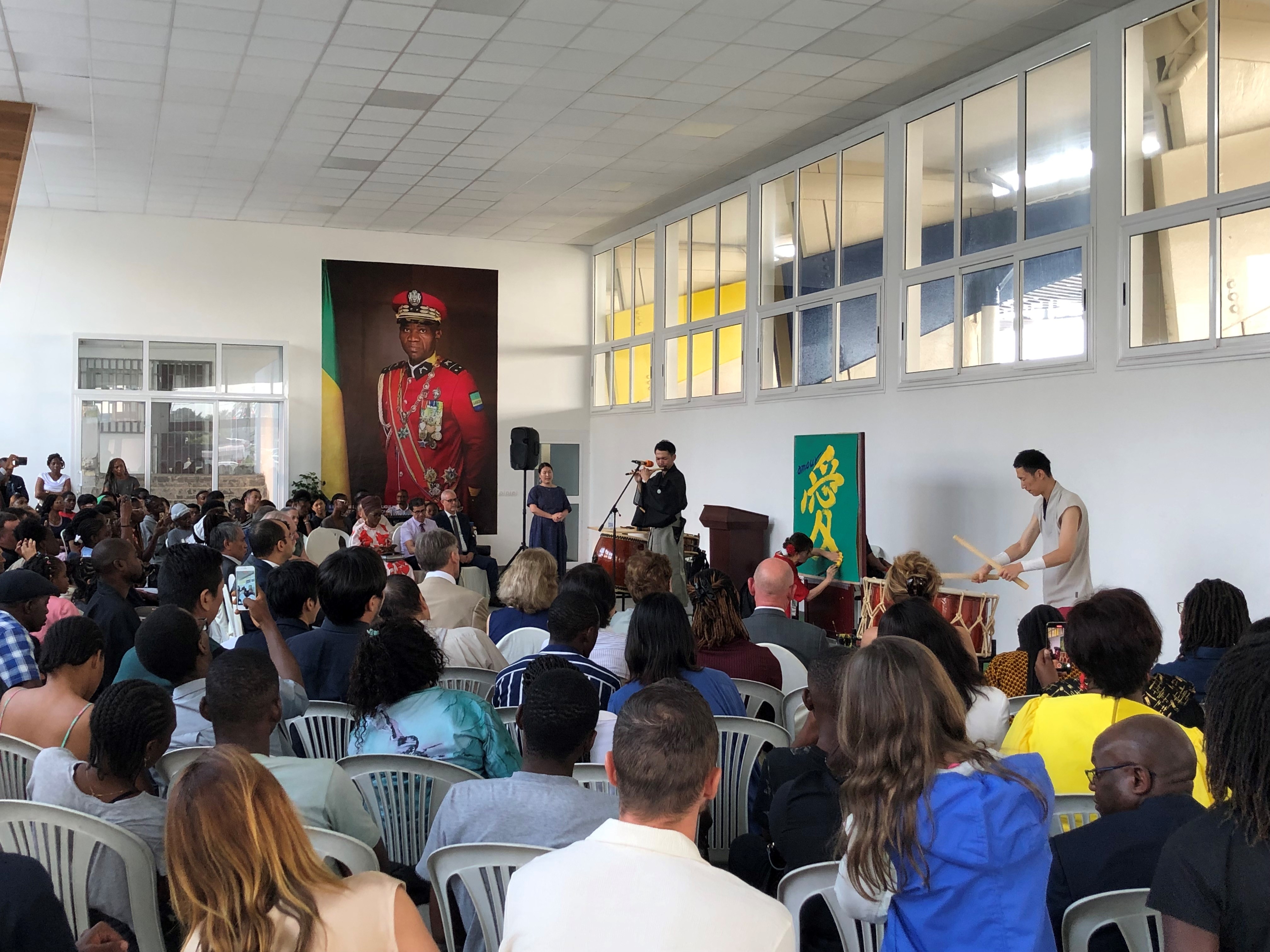 2月16日から18日にかけて、和太鼓奏者、篠笛奏者及び書道家のユニット「轟 & 紅花」がガボンを訪問し、ガボン文化省、ジャン・イレール・オバム・エイエゲ中高一貫校及びオマールボンゴ大学との共催でコンサートや書道のワークショップを行いました。文化省のギャラリーで行われた公演では、アルマンド・ロンゴ・モウレンギ文化大臣等のガボン政府関係者、当地リーブルビルの各国大使をはじめとする外交団や日本に興味のあるガボン人の皆様など、多くの方々が、太鼓の体験を行ったり音楽に合わせて手拍子をとりながら、日本の伝統音楽や書道を楽しみました。また、ガボンの伝統音楽のグループ「Zulu de Mandji」とのコラボレーションも行い、日ガボンの二国間の文化交流を通じた協力を象徴する舞台となりました。