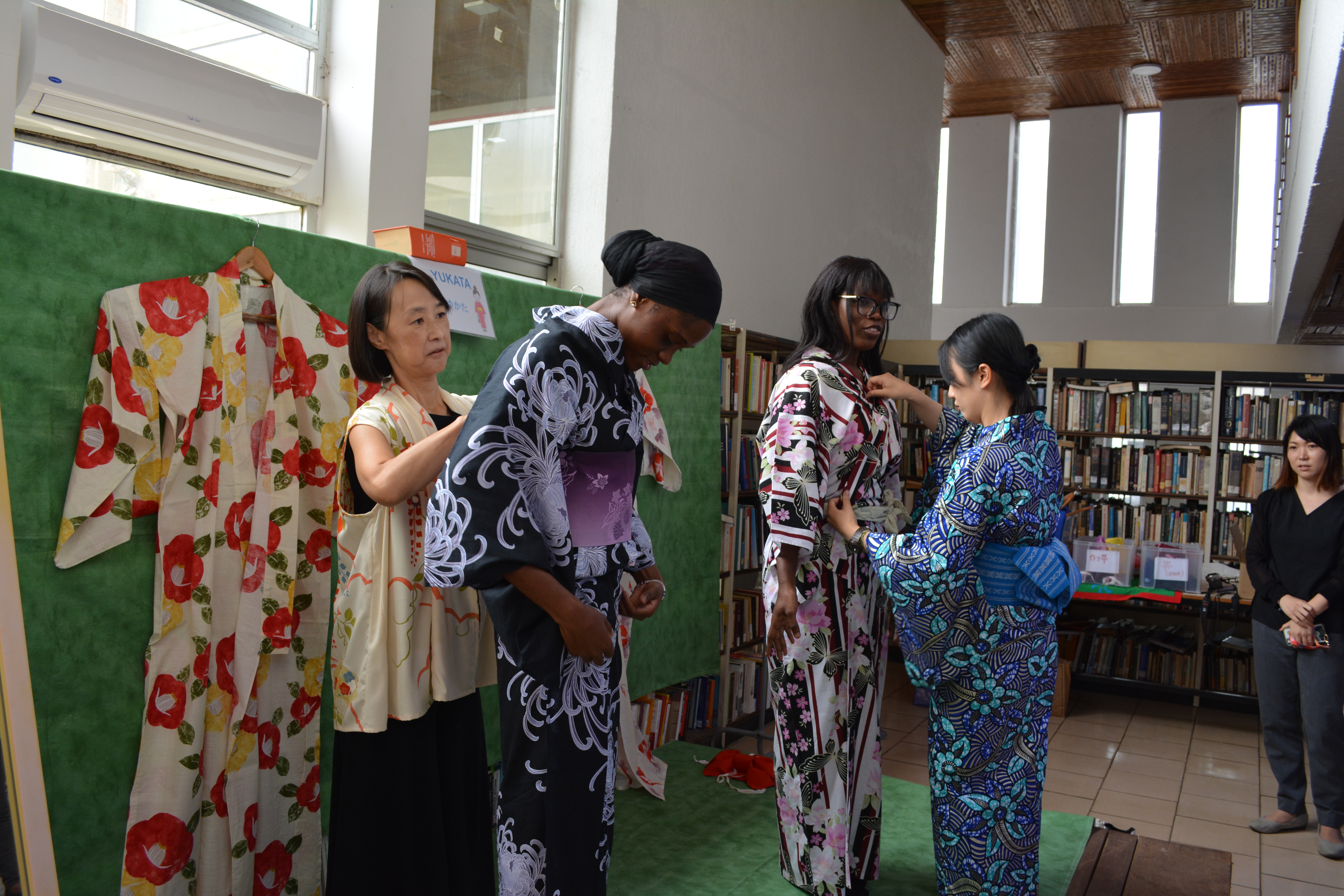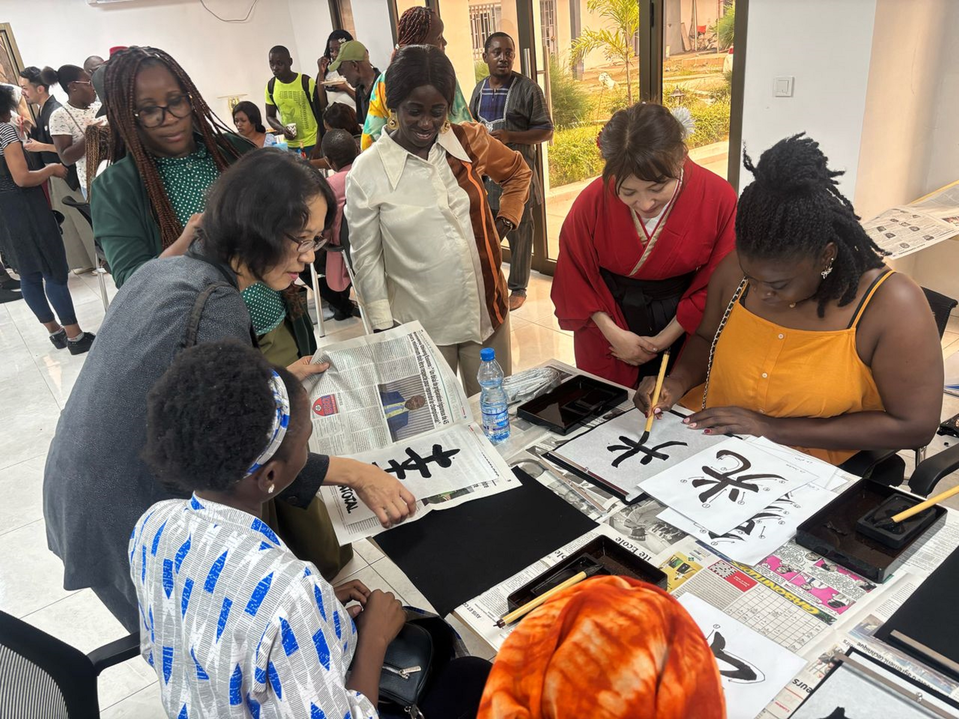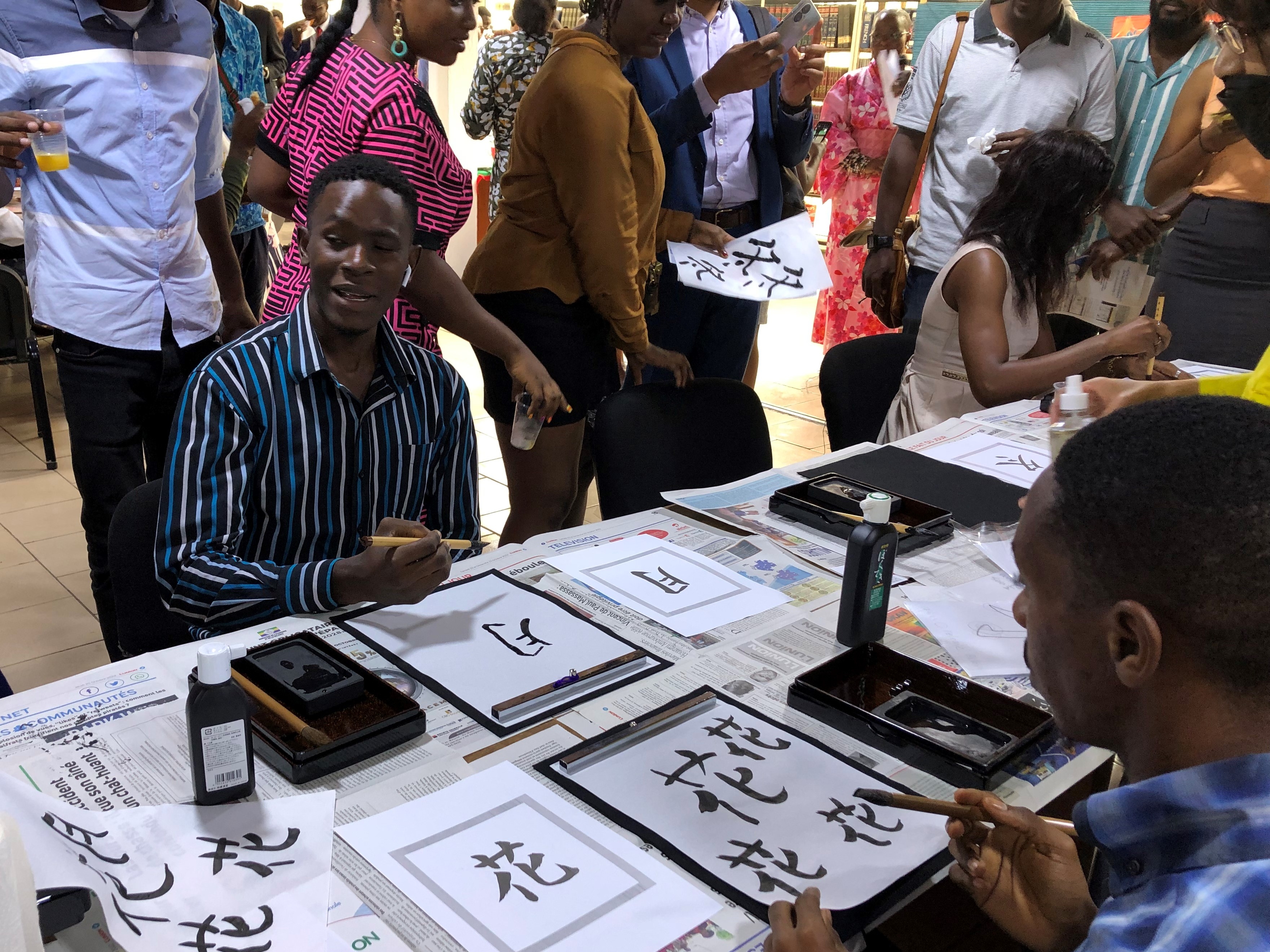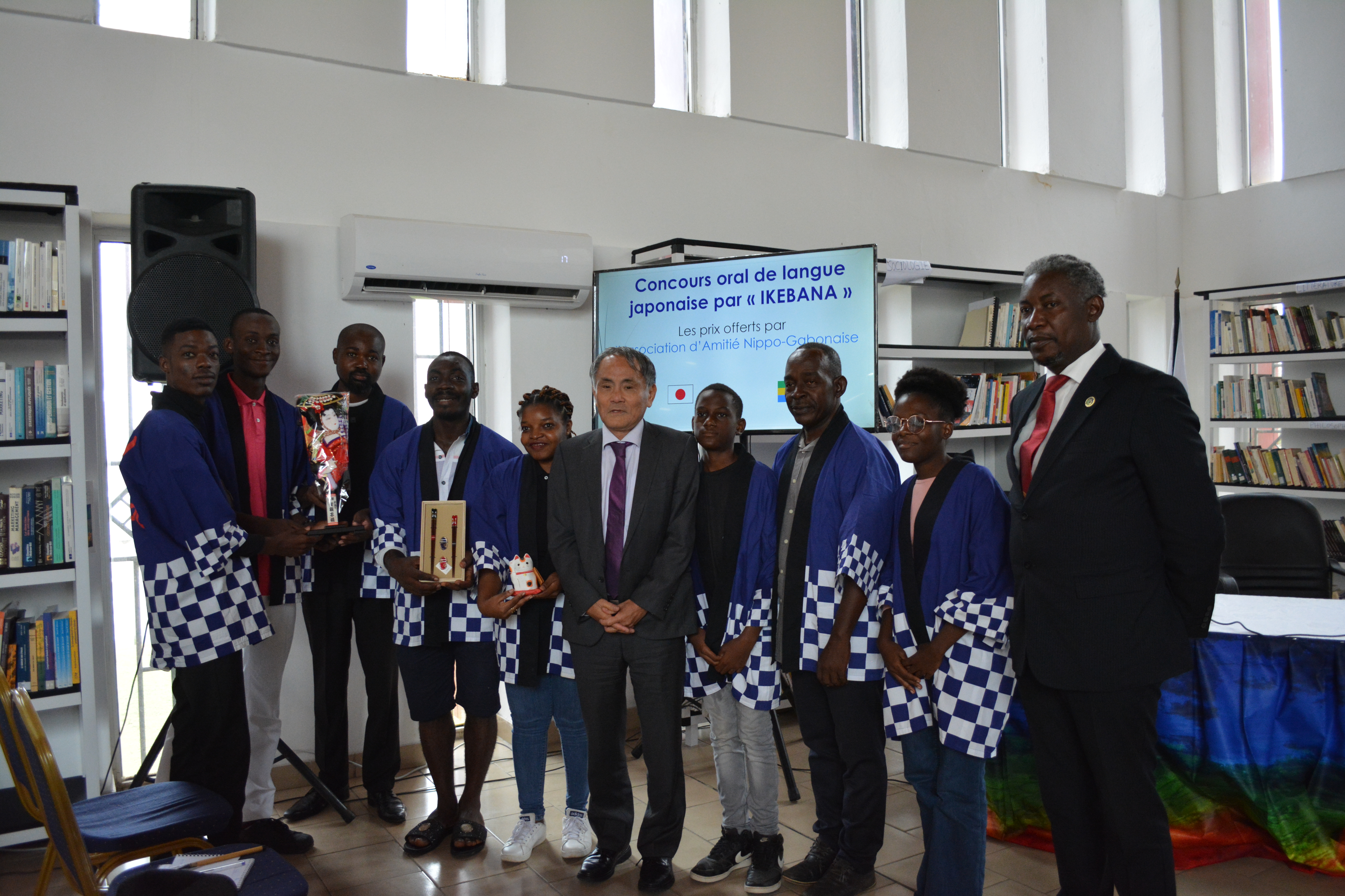 まずは、日本からガボンを訪問したJICA緒方貞子平和開発研究所の萱島信子シニア・リサーチ・アドバイザーが「日本の教育の近代化の歴史」に関する講演会を行い、ご来場頂いた多くの方に日本の教育について学んで理解を深めていただきました。その後、日本文化のワークショップ(折り紙、書道、ゆかた試着)を開催し、日本文化を体験いただきました。更に、日本文化愛好団体の“IKEBANA”によるスピーチコンテストが「自分の好きな日本語」というテーマで開催され、入賞した3名に対し、日本ガボン友好協会から提供された賞品を野口大使から授与しました。