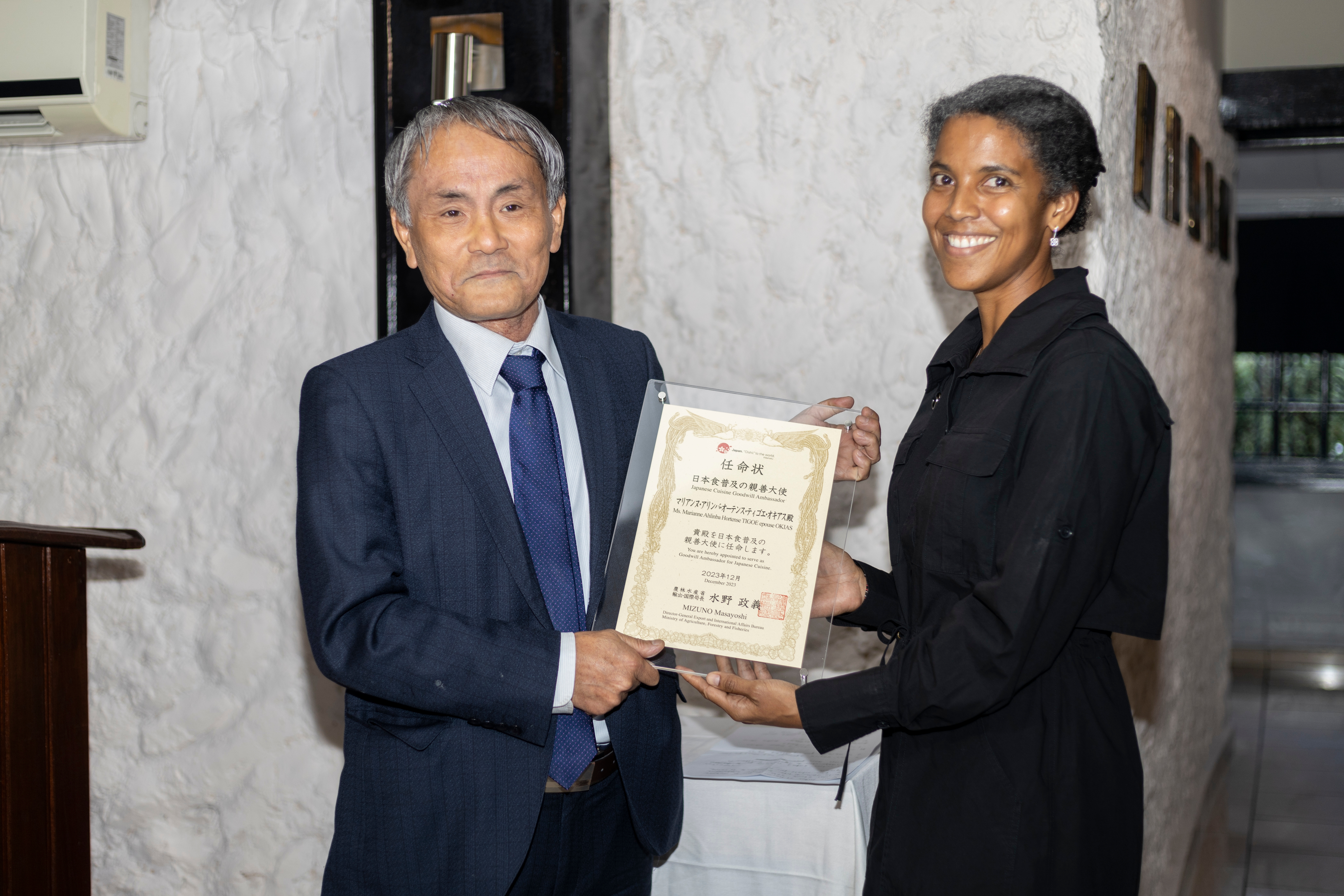 任命式は、普段から「SAKURA」を利用しているガボン政府関係者やオキアス氏の友人等が出席し、野口大使がスピーチにて2013年にユネスコの無形文化遺産に登録された「和食」の魅力について説明するなどガボンにおいて日本食の魅力を再確認する機会にもなりました。
