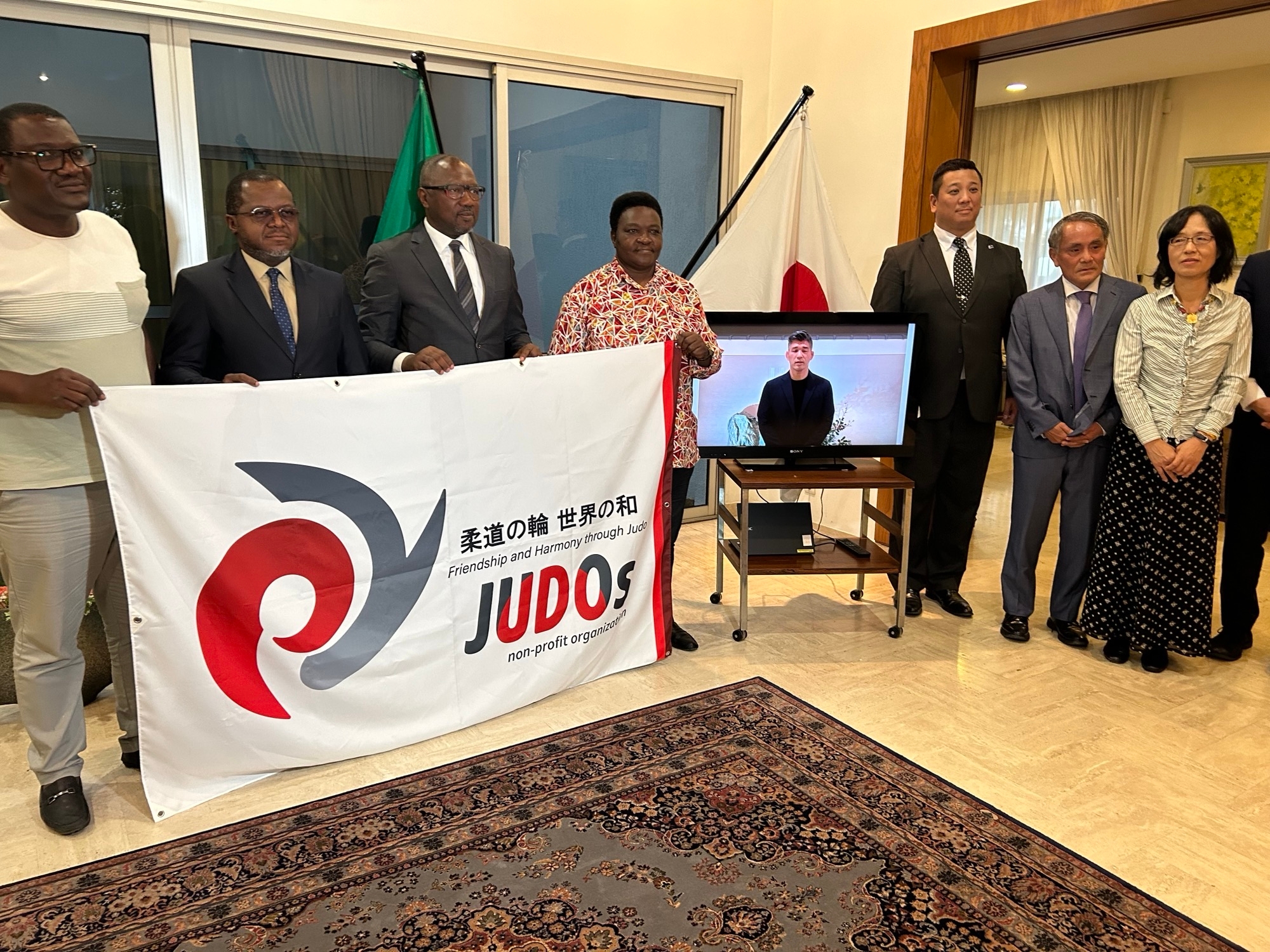 更に、「JUDOs」の井上康生理事長(シドニーオリンピック柔道金メダリスト)からガボン柔道連盟へ応援のビデオメッセージが届きましたので、同大会の前日(8日)に、ガボン柔道連盟と将来が期待される有望なガボン人柔道家を大使公邸にお招きし、ビデオメッセージを鑑賞しました。ガボン日本国大使館は、今回のメッセージで勇気づけられたガボン人柔道家が将来活躍することを大いに期待しています。