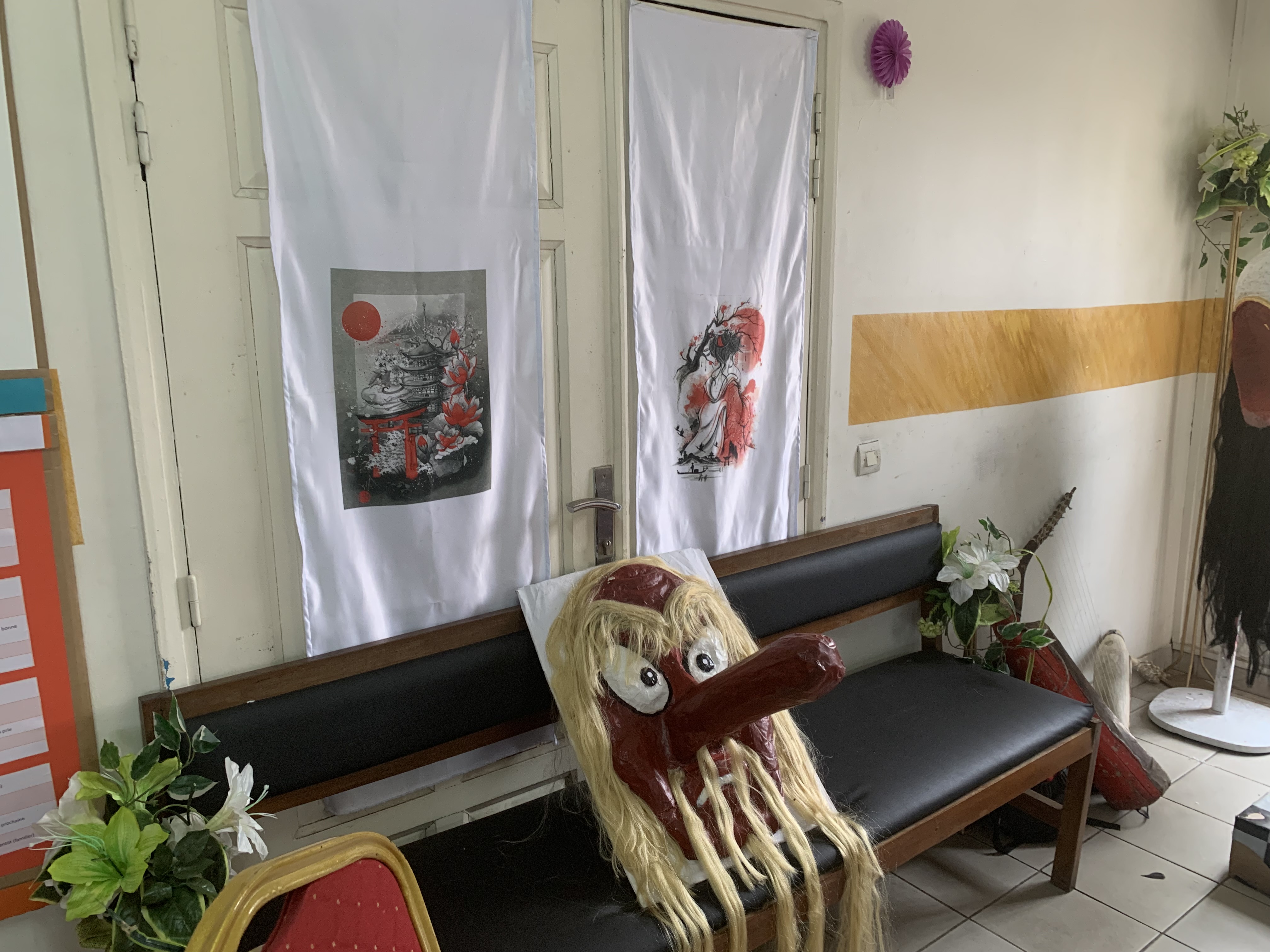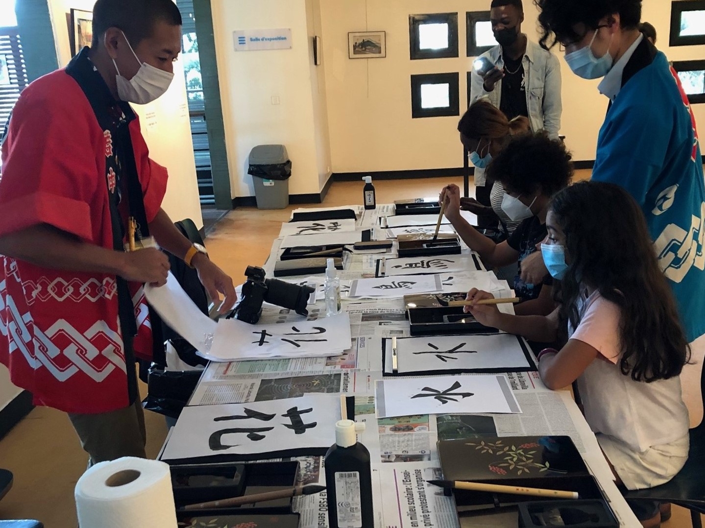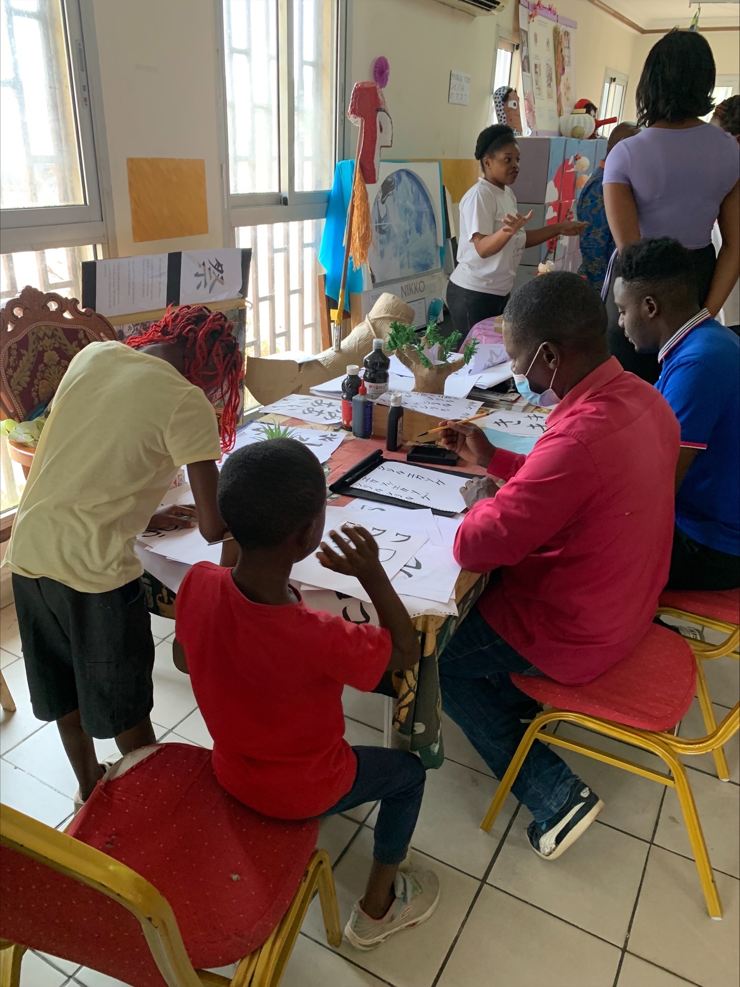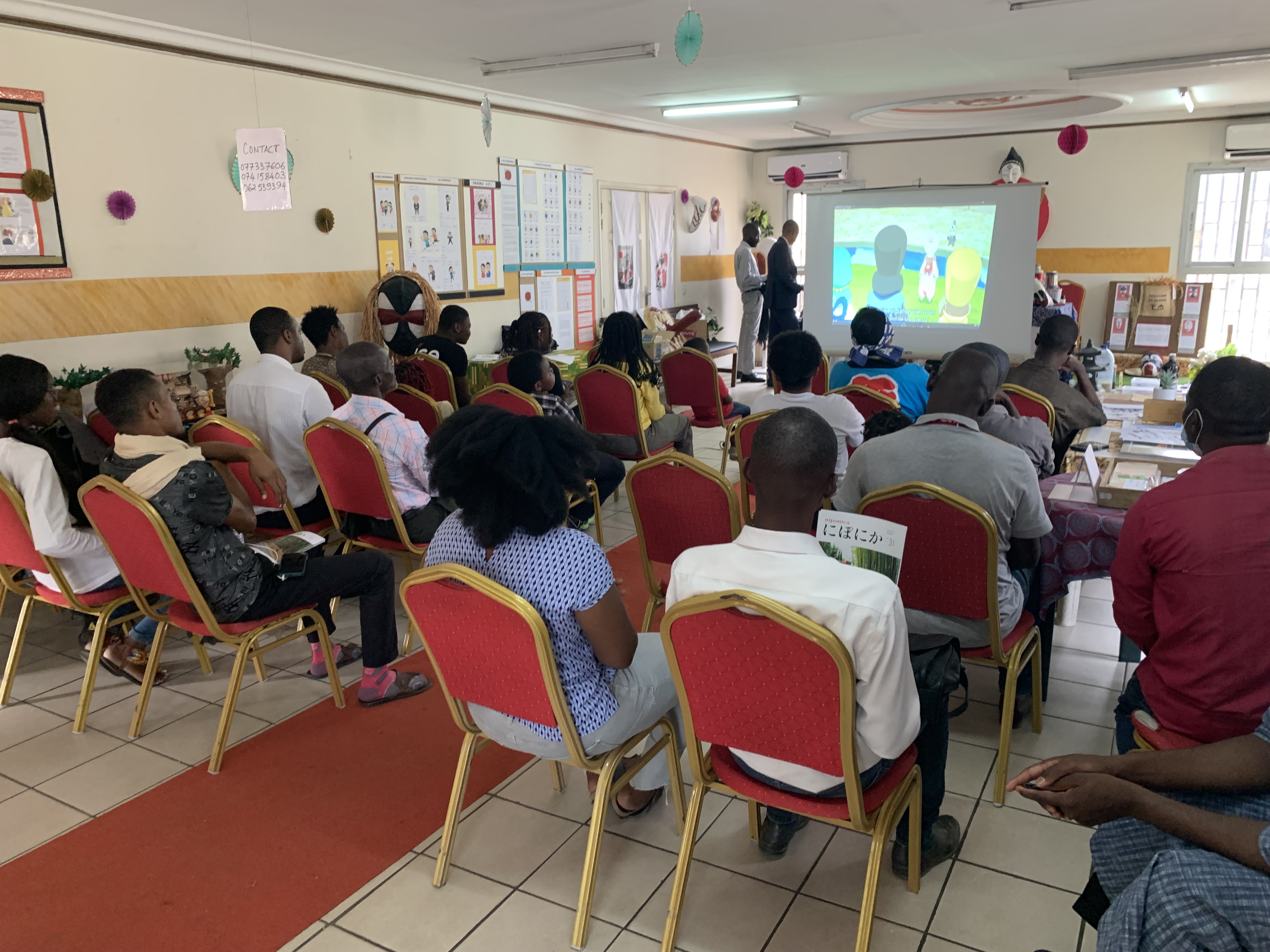 日本文化愛好団体のIKEBANA及びEBEL VERTとの共催で日本・ガボン文化週間を開催しました。EBEL VERTが作成した日本とガボンのマスクの展示や、IKEBANAによる日本語や書道のワークショップなどが行われました。また、「ポッピンQ」の映画上映を行い、日本・ガボン文化週間を通じてガボンの若者が日本文化を楽しみ大いに盛り上がりました。