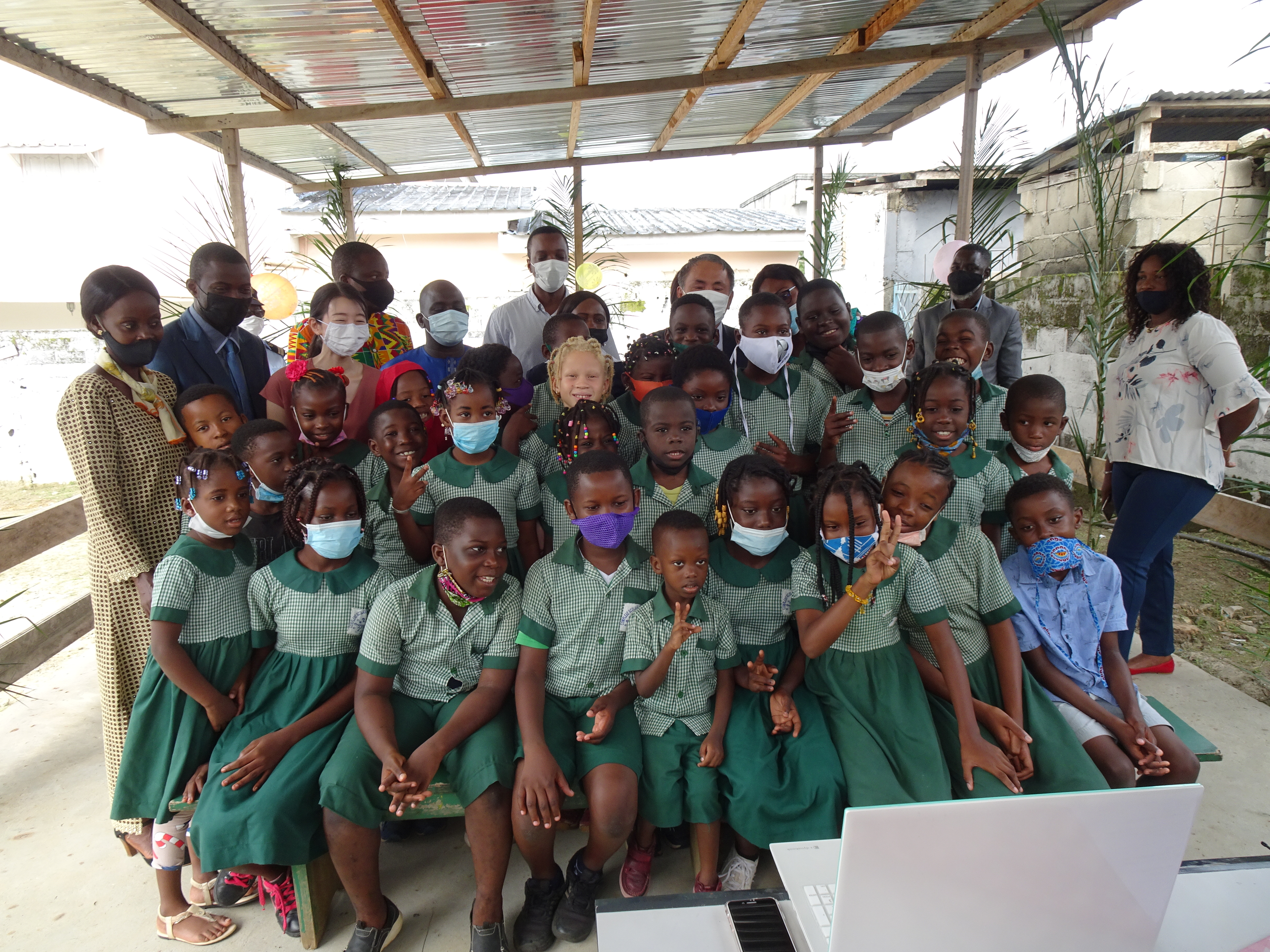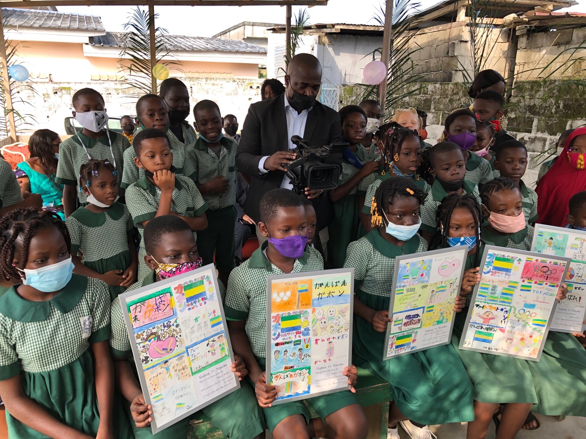 令和3年(2021年)6月25日、岩手県二戸市の仁左平小学校とアカンダのエリート・コンプレックス・スクールのオンライン交流を行いました。 きっかけは仁左平小学校の児童がガボンに対するオリンピック応援メッセージカードを作成したことです。児童が、作成したカードを実際にガボンの人に見てもらいたいと願ったことから、二戸市と当館が協力して、以前仁左平小学校と交流のあったエリート・コンプレックス・スクールにカードをお届けしました。仁左平小学校の子供たちに代わって、野口大使がカードを渡しました。